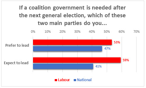 Overall, 59% of decided voters are expecting Labour to lead a coalition government if one is needed. 41% expect National would lead it.