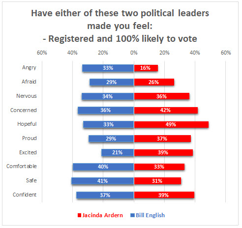 Now a Horizon poll finds Ardern making voters who are both registered and 100% likely to vote, feel significantly more hopeful (49% to 33%), excitement (39% to 21%) and pride (37% to 29%) than National Party leader Bill English.
