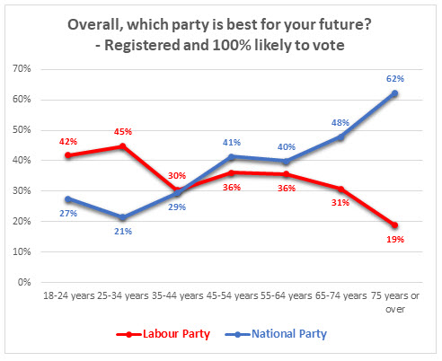 The two main parties are not completely immune from this: with those who think National is the best party for their future, 2% intend to vote for the Labour Party, 2% for New Zealand First, 1% for ACT New Zealand and 1% for the Green Party.  For those who think Labour is the best party for their future, 1% intend to vote for National, 1% for New Zealand First and 2% for the Green Party.