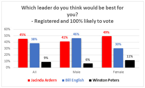 When asked “which party leader do you think will be best for you?” Labour leader Jacinda Ardern scores 48%, National Leader Bill English 35% and New Zealand First leader Winston Peters 9%.