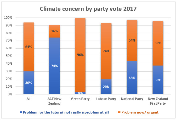 54% of those who gave National their party vote at the 2017 general election, 74% of Labour, 96% of Green and 54% of New Zealand First voters think climate change is a problem for now or urgent.