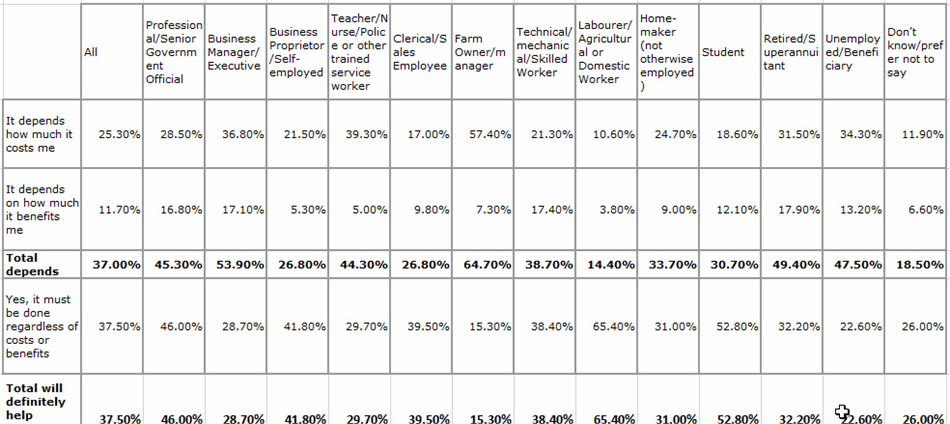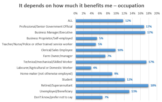 Those most worried about personal benefits to them are business decision makers, professionals, senior government officials, technical mechanical and skiled workers and the retired.