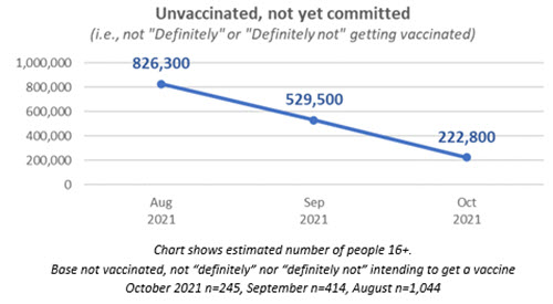 As vaccination rates increase considerably with nationwide efforts, the pool of people who are still likely to get vaccinated has correspondingly decreased. In October, 24% of the unvaccinated are likely to get the vaccine (3% of the population) compared to 33% of the unvaccinated population in September (6% of the population) and 70% in August (33% of the population).
