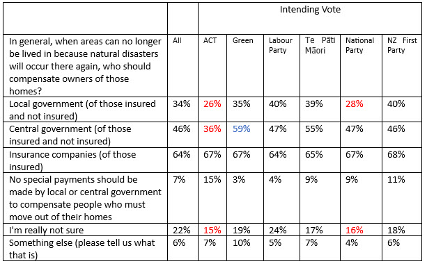 Intending voters for ACT (15%), NZ First (11%), and National and Te Pāti Māori (each 9%) say no special payments should be made by local or central government to compensate people who must move out of their homes.