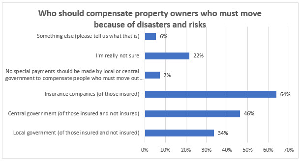 New Zealanders think insurance companies and local and central government should help compensate home owners whose homes or areas can no longer be lived in because natural disasters will occur there again.