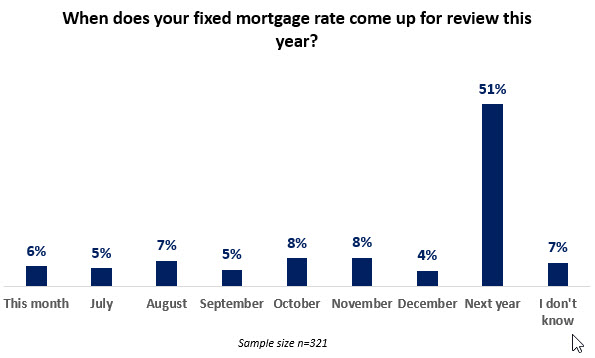 30% of fixed mortgage holders say interest rate reviews are due between June and October 2023. 51% of reviews occur next year (2024).