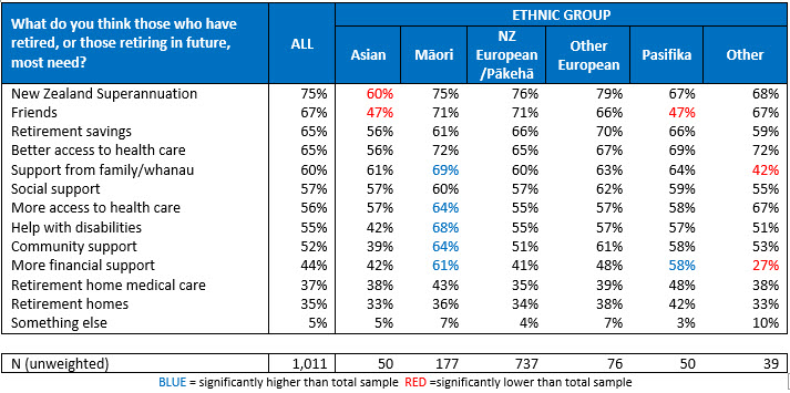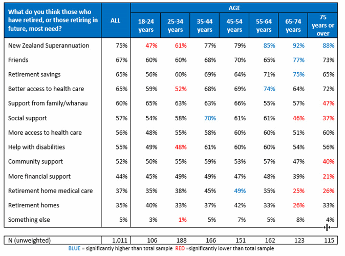Among those aged 65-74 years 92% said New Zealand superannuation was needed and 77% said friends.