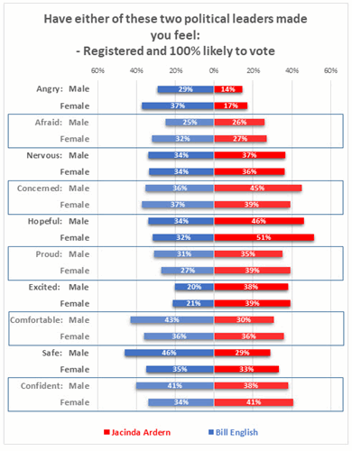 English makes a higher percentage of women than men angry or afraid, but paradoxically, more women and men felt safe and fewer felt nervous or concerned with English than with Ardern.