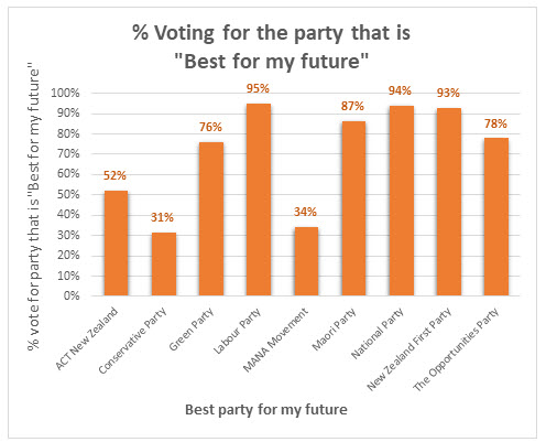 All of these parties appear to have more underlying support than party vote support;  the percentage of those who think they are the party that is best for their future and intend to cast their party vote for that party is less than 80% and, in the case of the Conservative Party and MANA Movement, less than 35%.