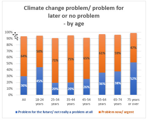 While 50% of 18 to 24 year-olds think climate change is a problem for now or urgent, 45% of them think it is a problem for the future, making them and those aged 75+ the least concerned of all age groups.