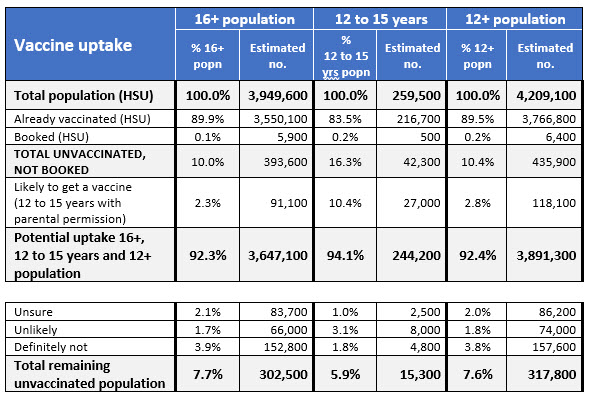 The research finds the overall potential uptake by Māori respondents, including those already vaccinated and those who are likely to get a vaccine, has increased to 78% in October, up from 73% in September (the margin of error for the Māori sub-sample at a 95% confidence level is ±6.8%).