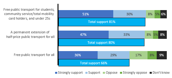The finding that four in five adults support a permanent extension of half-price public transport for everyone, compares with a recent 1,000- respondent 1News Kantar Public Poll which found 79% support and 14% oppose.