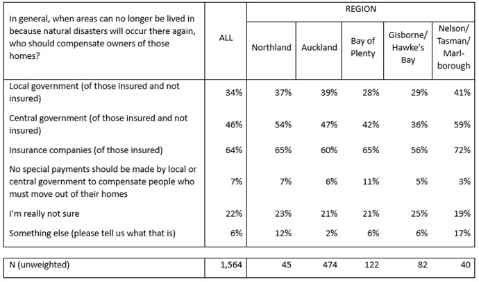 New Zealanders think insurance companies and local and central government should help compensate home owners whose homes or areas can no longer be lived in because natural disasters will occur there again.