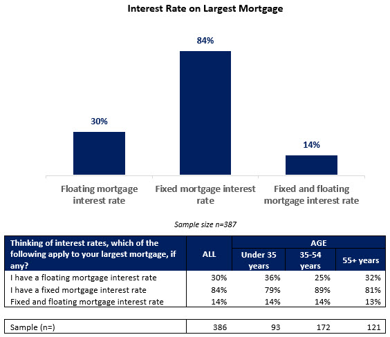 • 84% (1,125,000 adults) have a fixed mortgage on their largest mortgage, 30% a floating rate and 14% both fixed and floating.