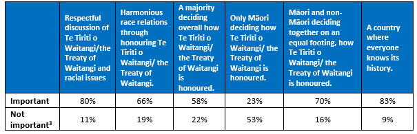 80% (3,231,000 adults believe that “Respectful discussion of Te Tiriti o Waitangi/the Treaty of Waitangi and racial issues” is important.