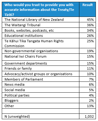 The five most trusted sources to provide accurate information about the Treaty/Te Tiriti are: